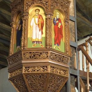 Ο ξύλινος άμβωνας είναι πλούσιος σε φιλοτεχνήματα και αξιόλογα σκαλίσματα. Φέρει συνήθως παραστάσεις των ιερών Ευαγγελιστών. Στο κέντρο του υπάρχει ανάγλυφο περιστέρι, πάνω στο οποίο τοποθετείται το ιερό Ευαγγέλιο και συμβολίζει το Άγιο Πνεύμα. Ο ξυλόγλυπτος άμβωνας μπορεί να κατασκευαστεί και να εγκατασταθεί, ανάλογα με τις ανάγκες και την διαρρύθμιση του Ιερού Ναού, ως κρεμαστός ή ως καθιστός άμβωνας.